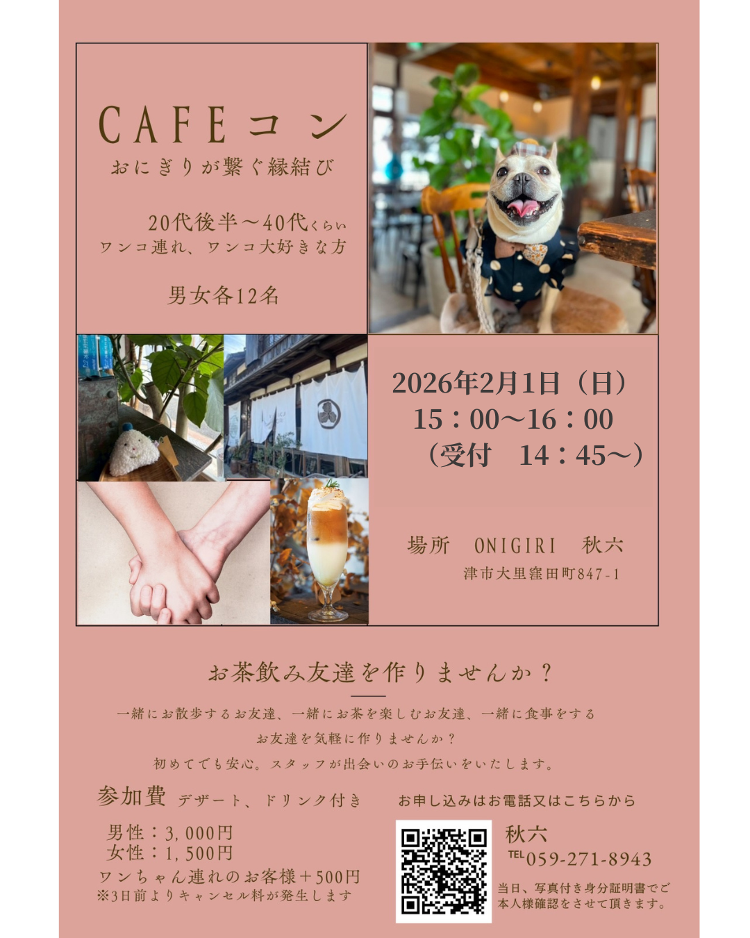 | イベント内容 | 三重県初ワンコ連れOK!! ワンコ大好きな独身限定、デザート、ドリンク付きのCAFÉコンです。 一緒にお散歩するお友達、一緒にお茶を楽しむお友達、一緒に食事をするお友達を気軽に作りませんか? 初めてでも安心。スタッフが出会いのお手伝いをいたします。 グループによる自己紹介、フリートークタイムを予定しています。 気に入った方に連絡先を伝えます。 1テーブルにスタッフ1名が付き会話のお手伝いをしますので、 初対面の方との会話が苦手な方でも安心してご参加頂けます。 ●写真付き身分証明書を当日ご提示ください。 |
