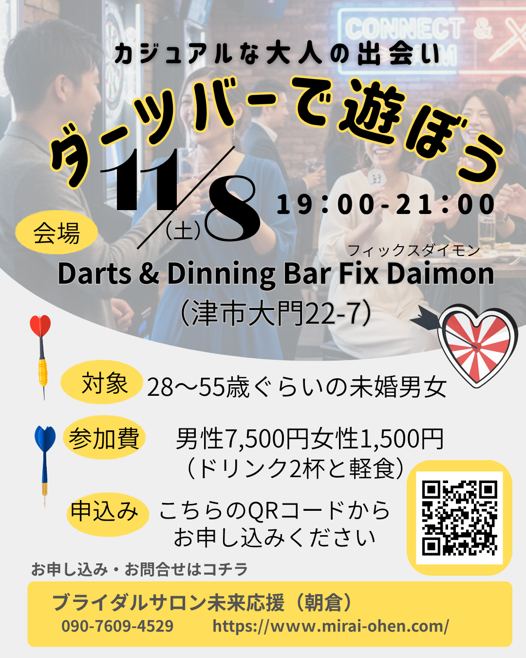 | イベント内容 | 津市大門エリアで人気のダーツバーでちょっとオトナな夜の出会いイベントです。