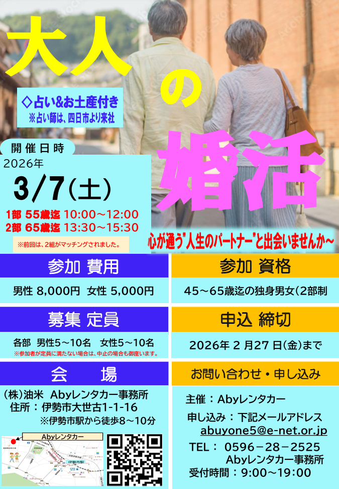 | 主催者連絡先 | 株式会社 油米 (担当 大西) TEL 0596-28-2525 / E-Mail abuyone5@e-net.or.jp |