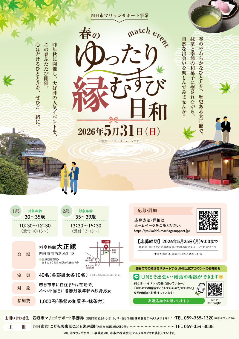| 主催者連絡先 | 四日市マリッジサポート事務局 (四日市市安島1-3-31 トナリエ四日市4階 株式会社デルタスタジオ内) TEL 059-355-1320(平日10:00~18:00) |