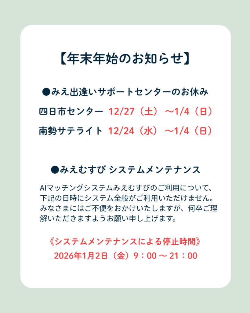 詳しくは、【総合】開所日のご案内をご確認ください。