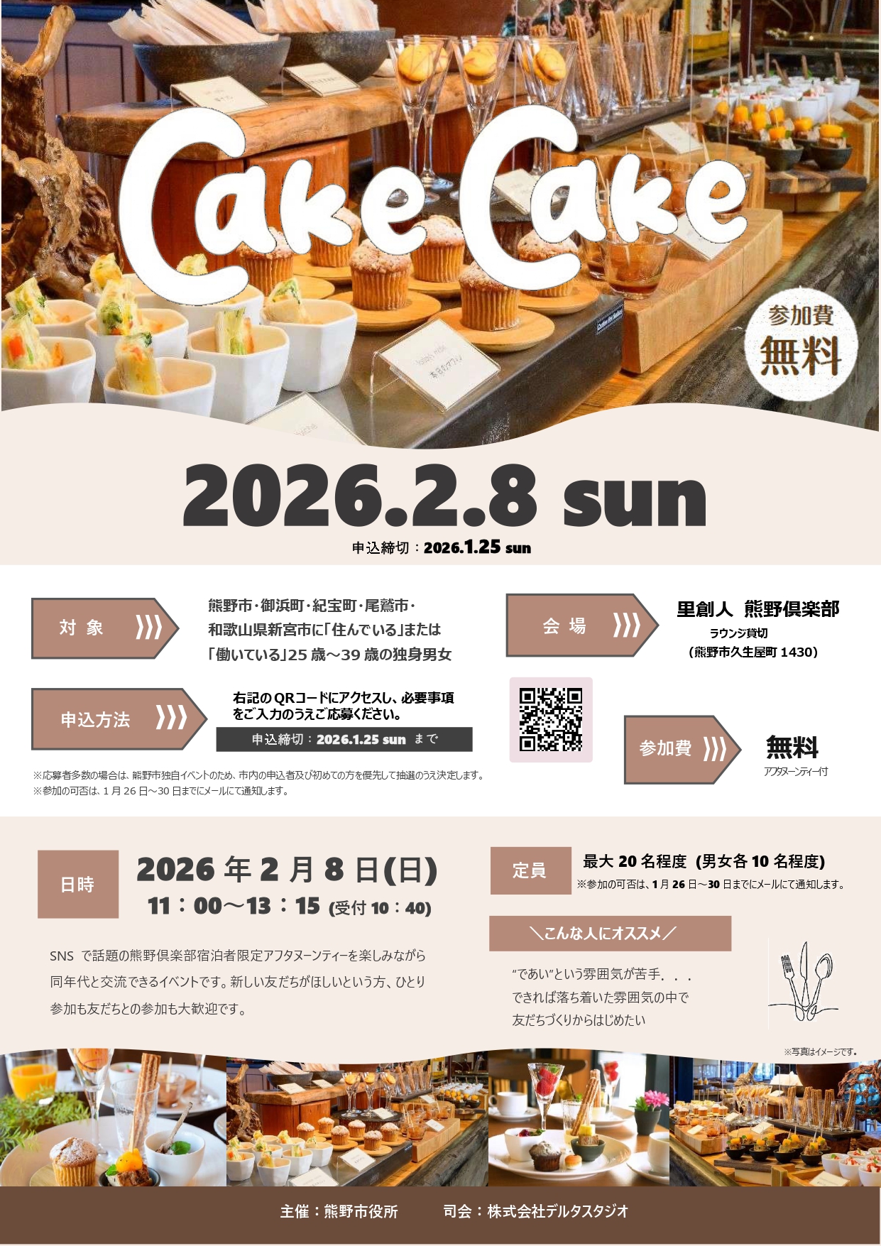 | イベント内容 | SNSで話題の熊野倶楽部 宿泊者限定アフタヌーンティーを特別に楽しめる交流イベント"CAKE CAKE"を開催します。 同世代の交流、新しい友だちづくりのきっかけにぜひどうぞ。 ひとり参加も、お友だちを誘っての参加もどちらも大歓迎です。 \こんな人にオススメ/ “であい”という雰囲気が苦手 ... できれば落ち着いた雰囲気の中で友だちづくりからはじめたい |