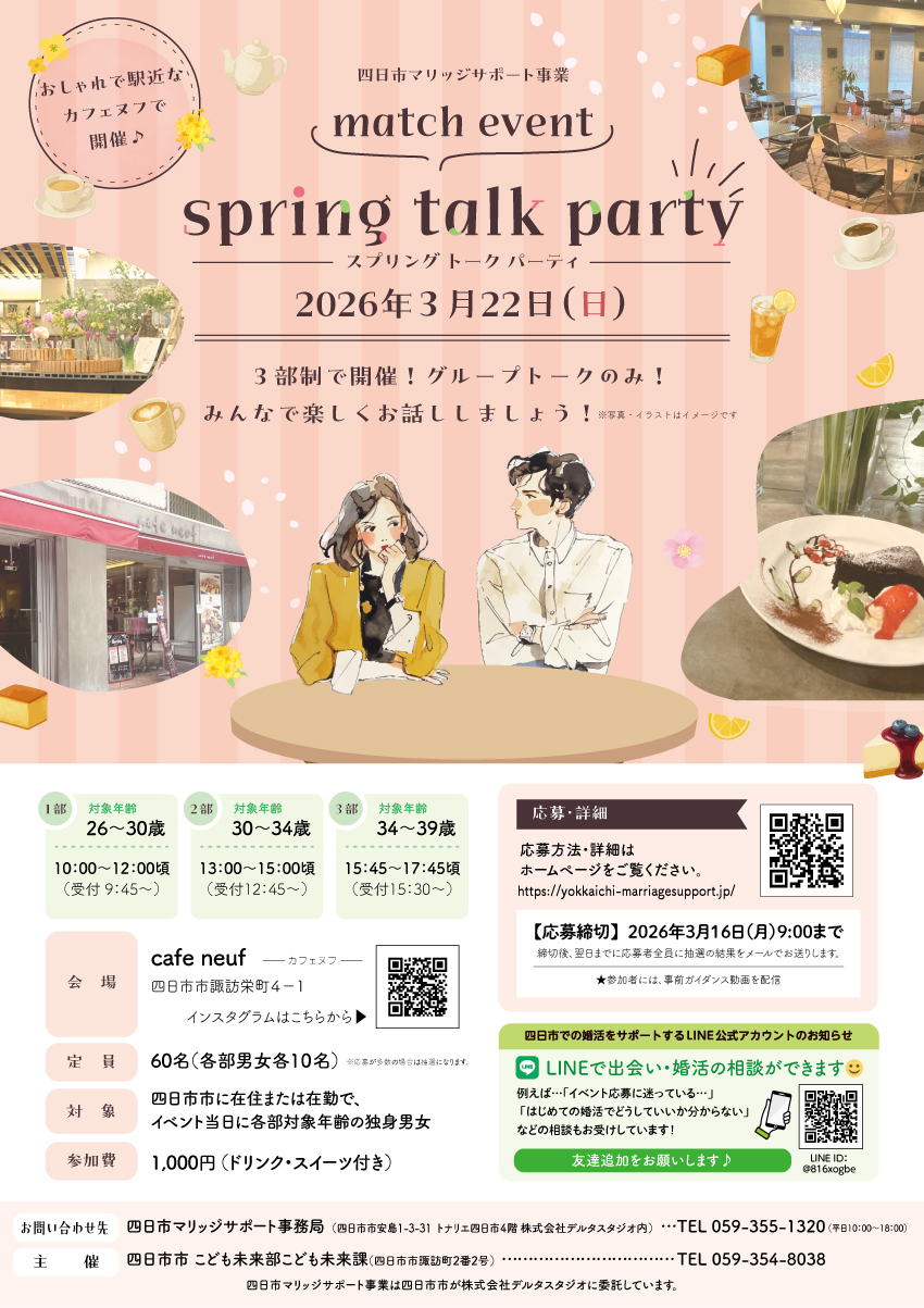 | 主催者連絡先 | 四日市マリッジサポート事務局 (四日市市安島1-3-31 トナリエ四日市4階 株式会社デルタスタジオ内) TEL 059-355-1320(平日10:00~18:00) |