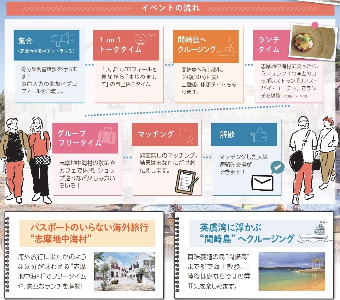 | イベント内容 | パスポートのいらない海外旅行 テーマパークでmatching event 少し遠方から、プチトリップにもオススメ 地中海村でのランチ、英虞湾に浮かぶ「間崎島」へのクルージングなどプチトリップを過ごせる1日。 1on1トークタイムやフリータイムなど、お話時間もたっぷり用意しています。 \insta人気も高い地中海村/ ・志摩の英虞湾を望む絶景と、地中海の雰囲気が漂う街並みを楽しめるリゾート宿泊施設 ・ミシュラン1つ★とのコラボレストラン「リアス・バイ・ココチャ」でランチ 公式サイトはこちら ![]() ![]() \クルージングタイム/ 英虞湾に浮かぶ間崎島まで海上散歩。上陸後、島での休憩タイムもあります。 (往復30分程度) ![]() ![]() ★好評★お友達と参加で参加費がお得に♪ 同性のお友達と2名で申込で参加費が安くなるペア割実施! 例えば、2名で4000円のところ… 男性ペア/3500円(500円お得に♪) 女性ペア/2000円(1人分無料に!?) |