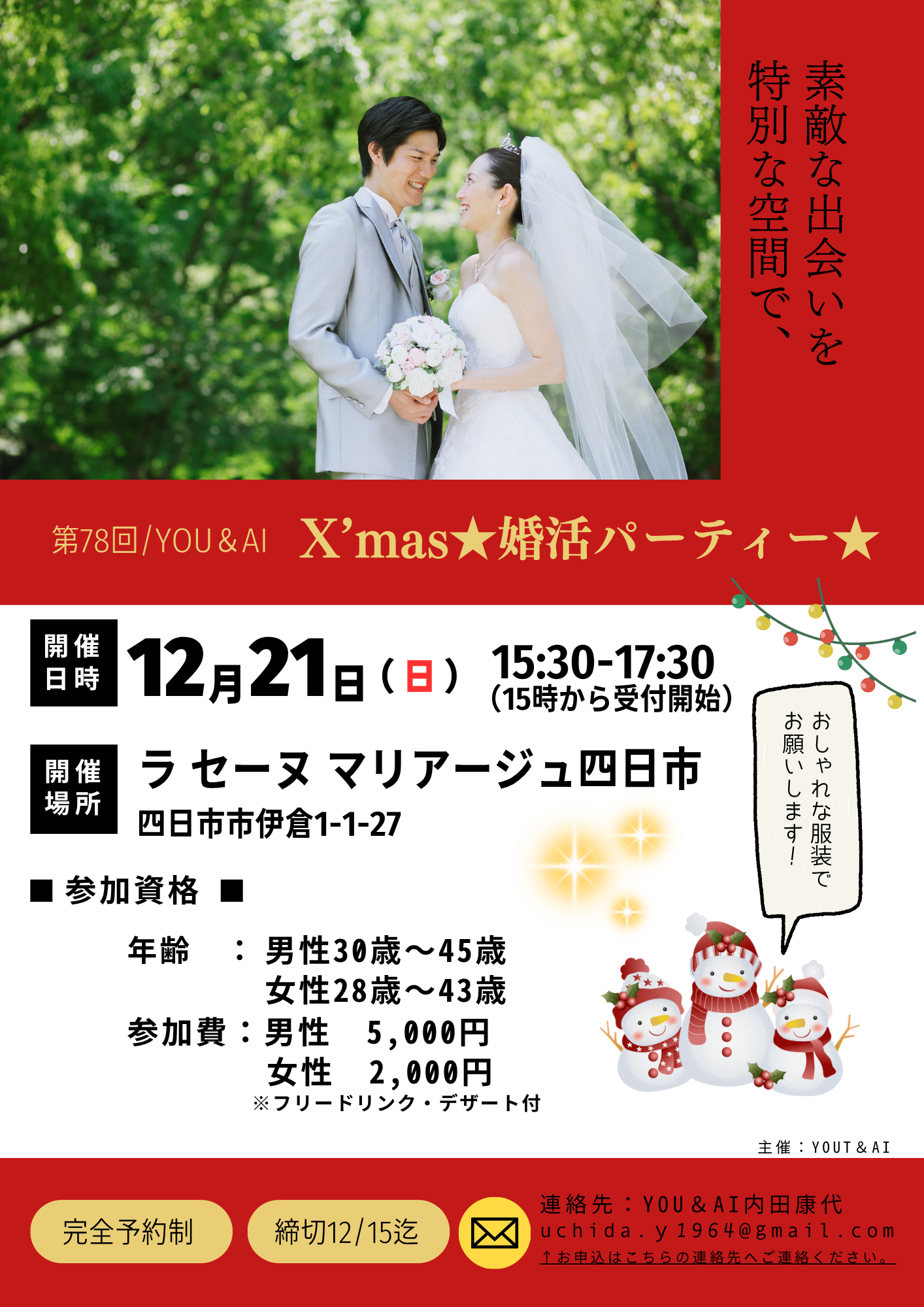 | イベント内容 | 素敵な出会いを・*:.。 。.:*・゚♡・*:.。 。.:*・゚ ・*:.。 。.:*・゚♡・*:.。 。.:*・゚特別な空間で 2025年最後の婚活パーティーで縁結びのお手伝いします! フリードリンク・デザートをお楽しみください。 お洒落な服装でご参加ください。 |